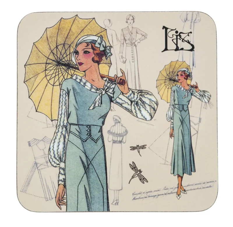 Este set de 6 posavasos “Bocetos de Moda años 20” presenta ilustraciones exclusivas inspiradas en los bocetos de moda originales de los años 20 y 30, conservados en el Museo Art Nouveau y Art Déco Casa Lis. Estas ilustraciones capturan la elegancia y el estilo atemporal de la Belle Époque y el Art Déco, trasladando el glamour de esa época dorada directamente a tu mesa.